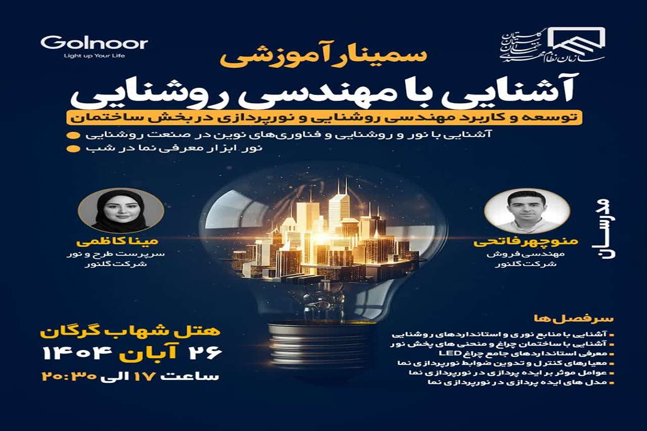 کمیته برق سازمان نظام مهندسی ساختمان استان گلستان با همکاری شرکت گلنور سمینار آموزشی "توسعه و کاربرد مهندسی روشنایی و نورپردازی در ساختمان" را برگزار میکند